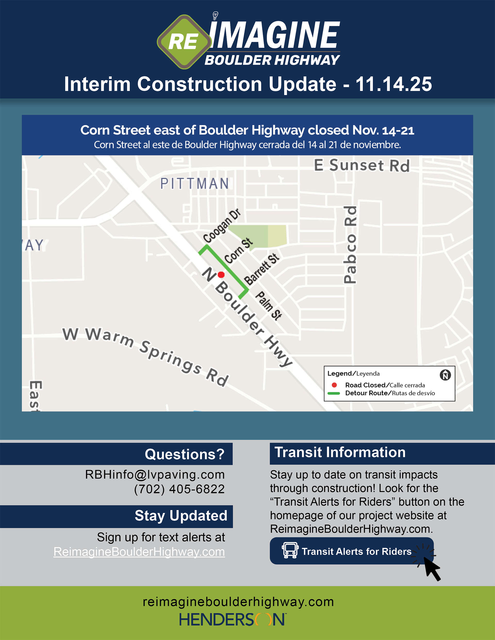 The City of Henderson’s Reimagine Boulder Highway is a historic roadway project that aims to make a generational impact by reshaping the future and safety of one of Nevada’s oldest thoroughfares, Boulder Highway. This 7.5-mile construction project, designed with community input, will bring several vital roadway improvements, such as center-running transit lanes with enhanced passenger shelters, upgraded storm drain system, new traffic signals, improved lighting, elevated buffered bike lanes, landscape treatments, and more.